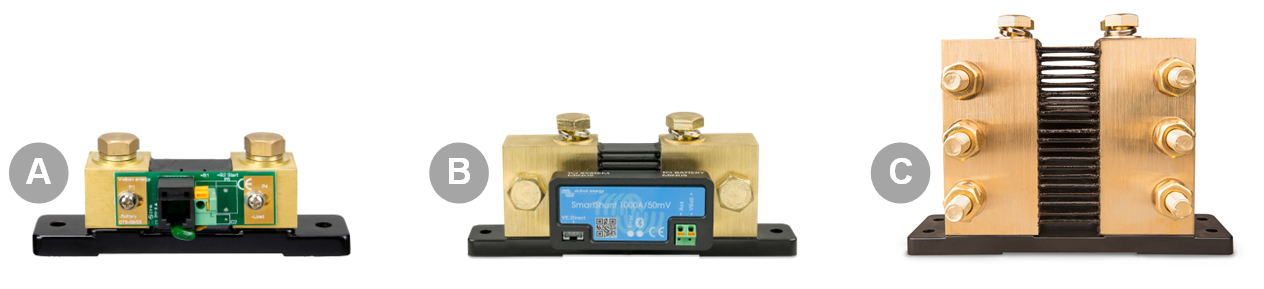 The shunt must be rated for the maximum DC current that will flow into the system's combined consumers. Example: An inverter connected to a battery will have a maximum current equal to its peak rating. A 3000VA inverter with a peak power of 6000W at 12V will draw a 500A current. | ||