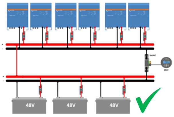 If the system has only one battery bank you should connect the battery bank in the middle of the busbars. But in the case of several parallel battery banks or smart batteries, they should also be distributed evenly along the busbars. | |