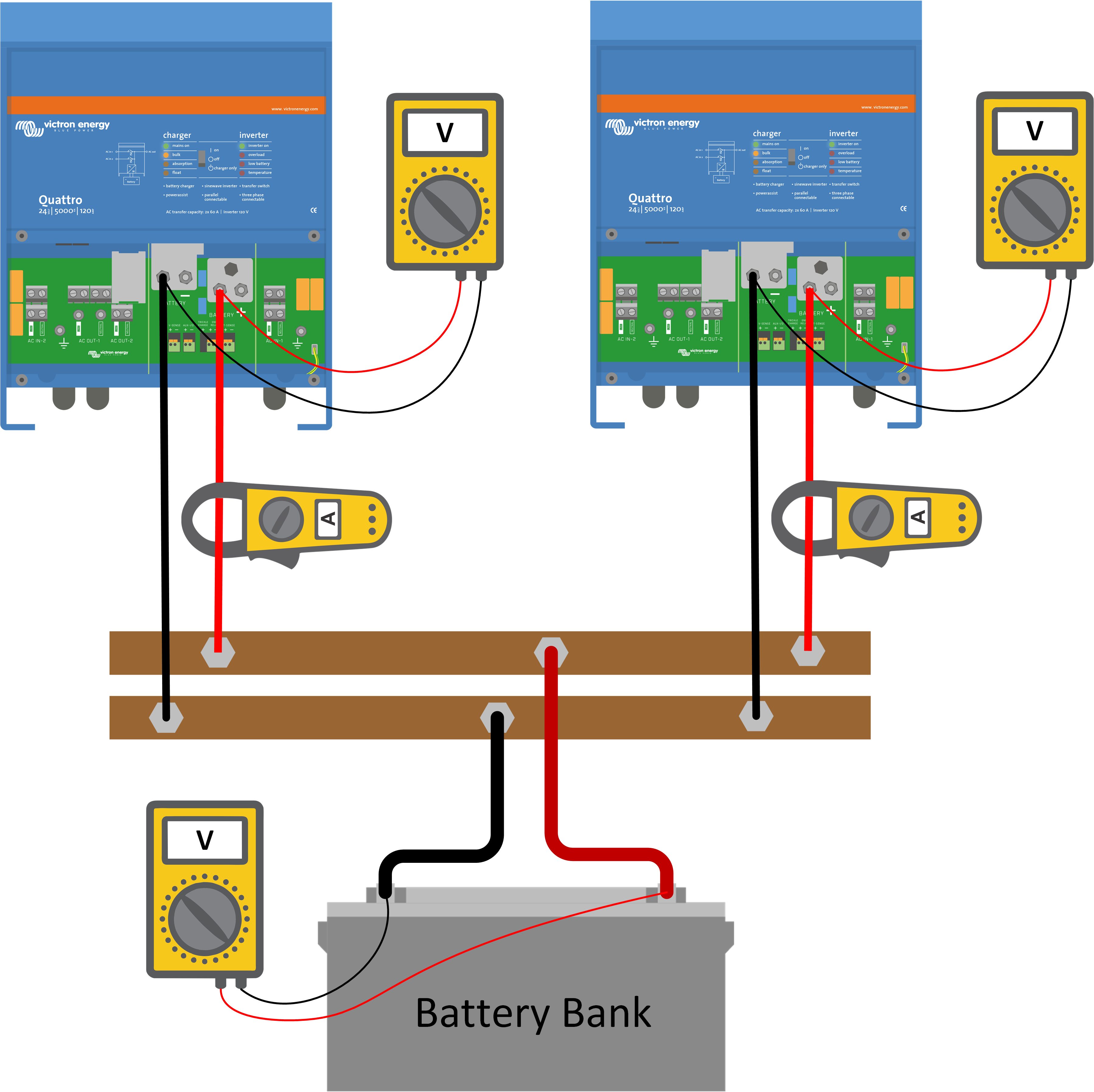 When wiring, make sure all inverter/chargers have the same cable length. Also, the solar chargers need to have approximately the same cable length. And the same for the batteries. | |