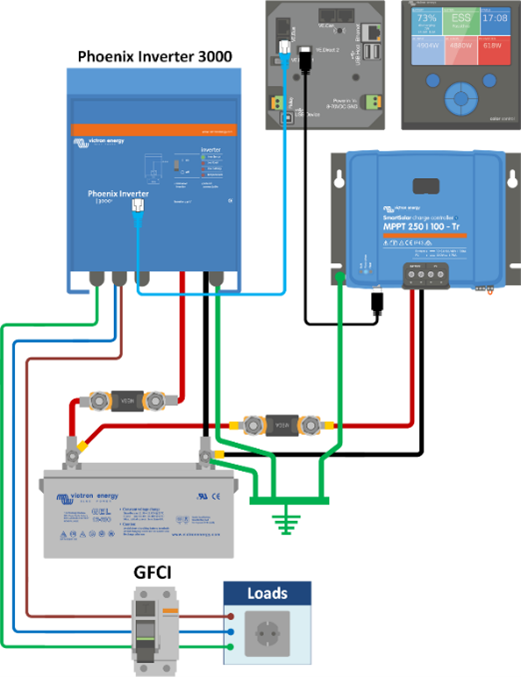 Grid-connected Energy Storage System (ESS) The DC ground cabling should be able to carry a fault current at least equal to the DC fuse rating. Connect the chassis of the inverter/charger to the ground busbar The AC-out ground may be taken from the central busbar or from the AC-out terminal. |