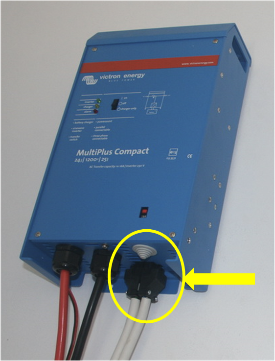 Si vous utilisez un convertisseur/chargeur de faible puissance, comme le MultiPlus Compact ou le Multiplus 500 à 2000 VA, il est facile de contourner manuellement le convertisseur/chargeur. Retirez simplement les fiches noires AC in et AC out du convertisseur/chargeur et insérez ces fiches l’une dans l’autre. | ![]() Fiches CA MultiPlus COmpact |