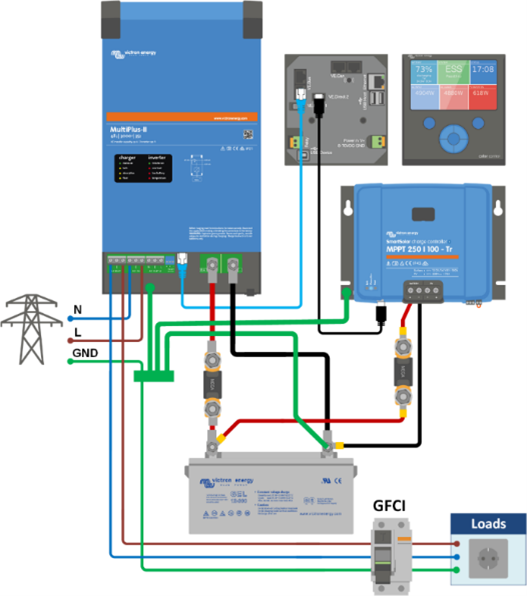 Hors réseau avec générateur Utilisez une seule prise de masse, à proximité de la batterie. Les pôles de batterie sont supposés pouvoir être touchés sans danger. La masse de la batterie doit donc être la connexion de masse la plus fiable et la plus visible. Le câblage de masse CC doit avoir une épaisseur suffisante pour pouvoir supporter un courant de défaut au moins égal à la capacité du fusible CC. De même, le câblage de masse CA doit pouvoir supporter un courant de défaut au moins égal à la capacité nominale du fusible CA. Un GFCI ne fonctionnera que si le châssis du Multi/Quattro est mis à la masse. |