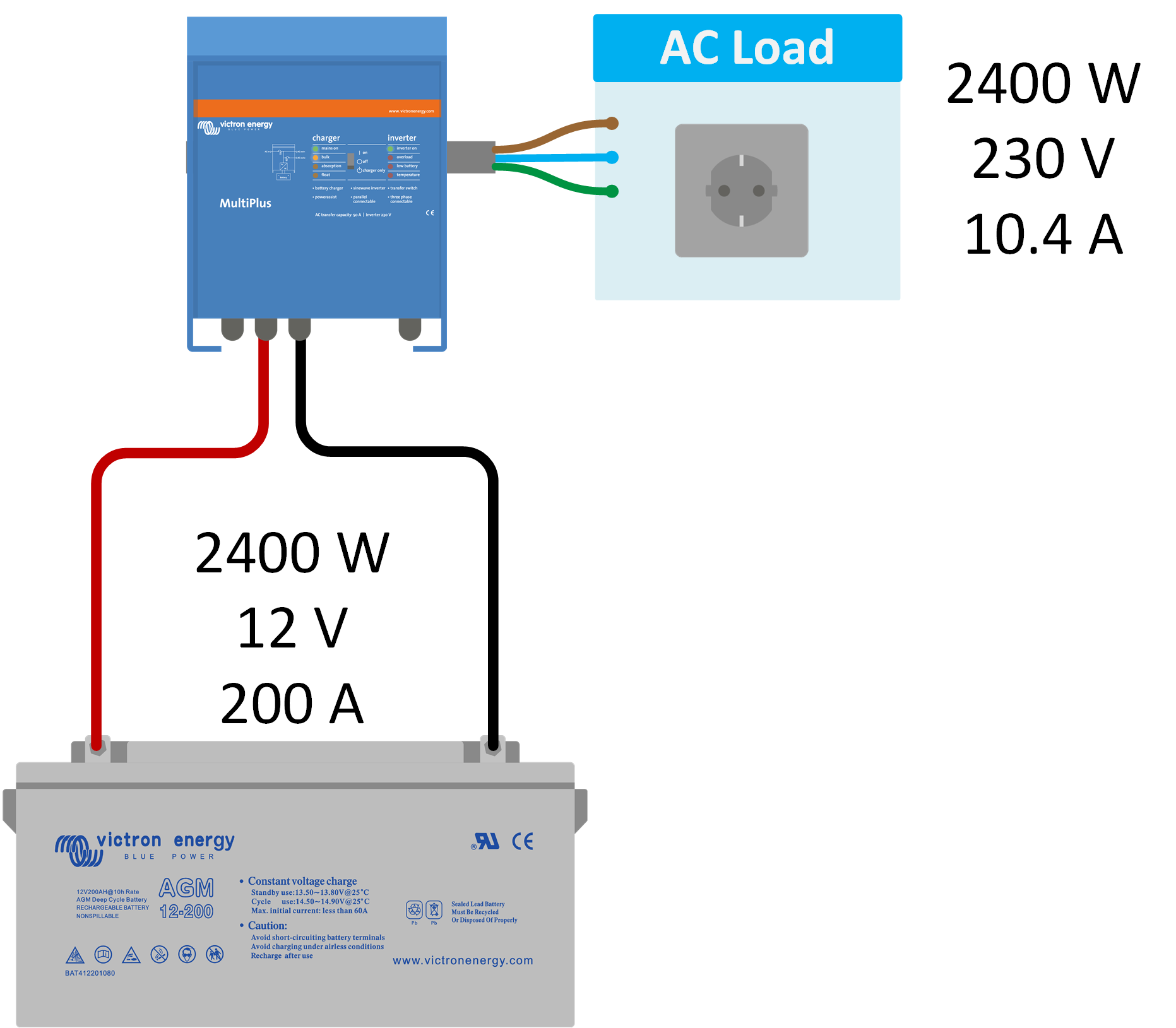 Avantages de l’utilisation de la puissance au lieu de l’intensité du courant dans les calculs : L’utilisation de la puissance dans les calculs ou pour les mesures présente un grand avantage : elle est indépendante de la tension. Cette mesure est utile dans les systèmes où il existe plusieurs tensions. Par exemple, il peut s’agir d’un système avec une batterie en courant continu, une alimentation en courant alternatif et peut-être un panneau solaire avec une tension continue différente de celle de la batterie. La puissance reste la même malgré les différences de tension. Par exemple, si vous faites fonctionner un consommateur CA de 2400 W via un convertisseur à partir d’une batterie de 12 V, il faudra également prélever 2400 W de la batterie (en ignorant les inefficacités du convertisseur). |