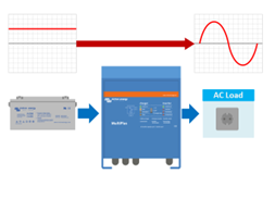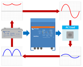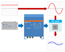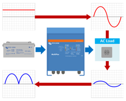 L’ondulation est l’un des effets négatifs d’une forte chute de tension dans un système. L’ondulation se produit dans les systèmes équipés d’un convertisseur : L’ondulation apparaît dans un système où la source d’alimentation est une batterie (CC) et le consommateur est un appareil CA. C’est toujours le cas dans un système avec un convertisseur. Le convertisseur est connecté aux batteries, mais il alimente un consommateur CA. |