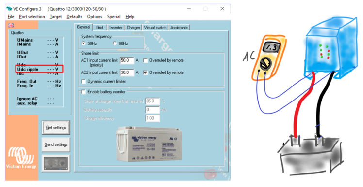Comment corriger l’ondulation : L’ondulation se produit uniquement en cas de chute de tension dans un système. Pour résoudre les problèmes de tension d’ondulation, vous devez réduire la chute de tension. En d’autres termes, vous devez réduire la résistance sur le trajet entre la batterie et le convertisseur, puis entre la batterie et le convertisseur. Pour plus d’informations, voir le chapitre Intensité du courant, résistance du câble et chute de tension. | |