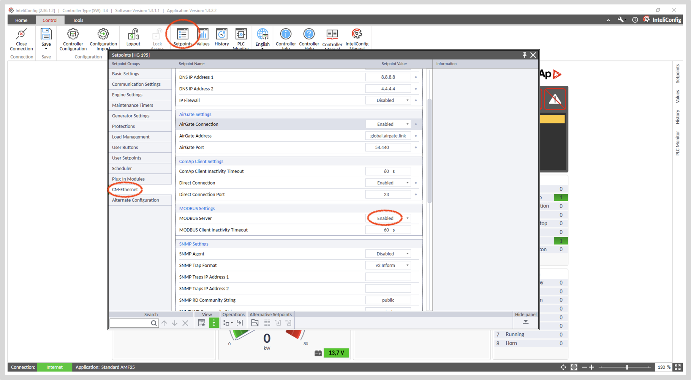Motor parameters volgen: Bewaak druk, temperatuur, RPM, startaccu spanning en brandstoftank niveaus.